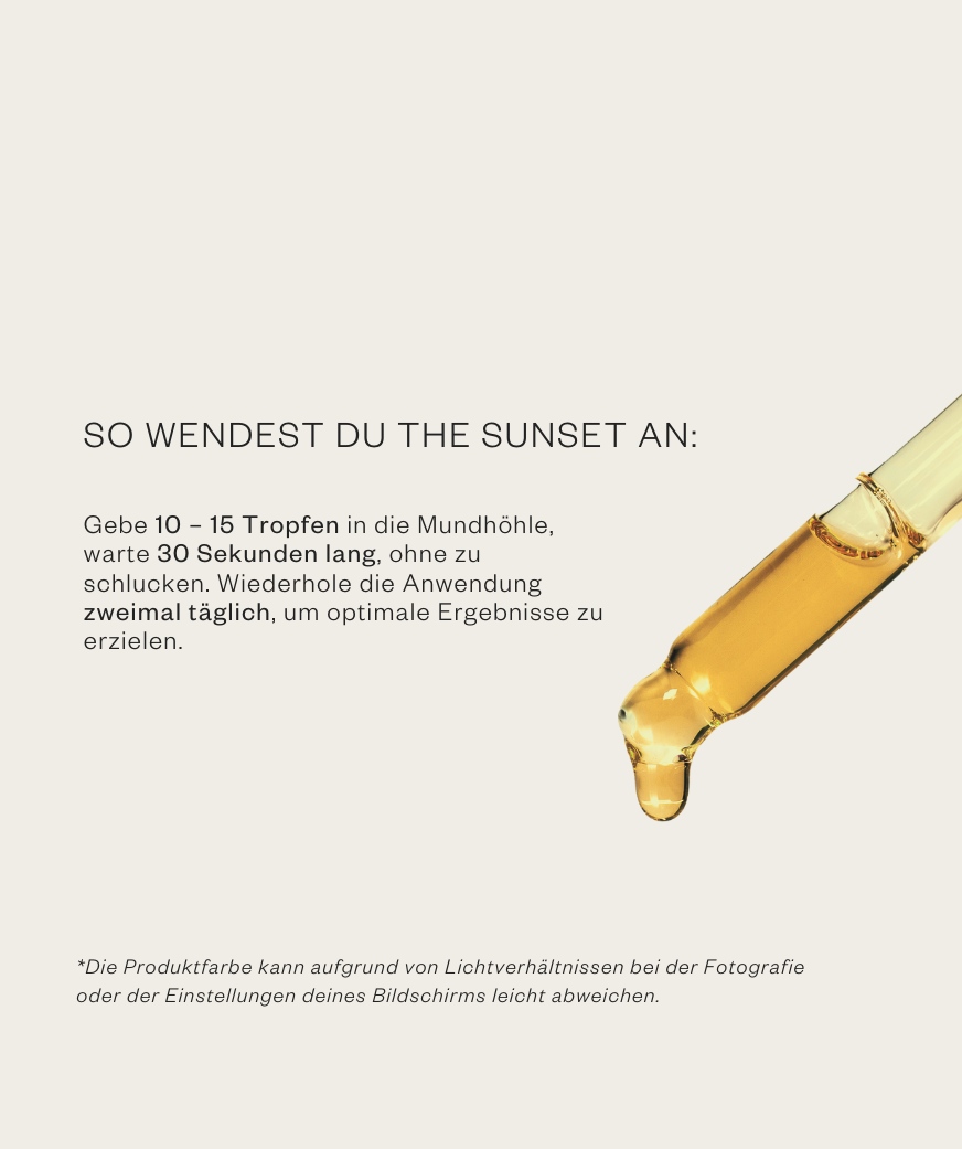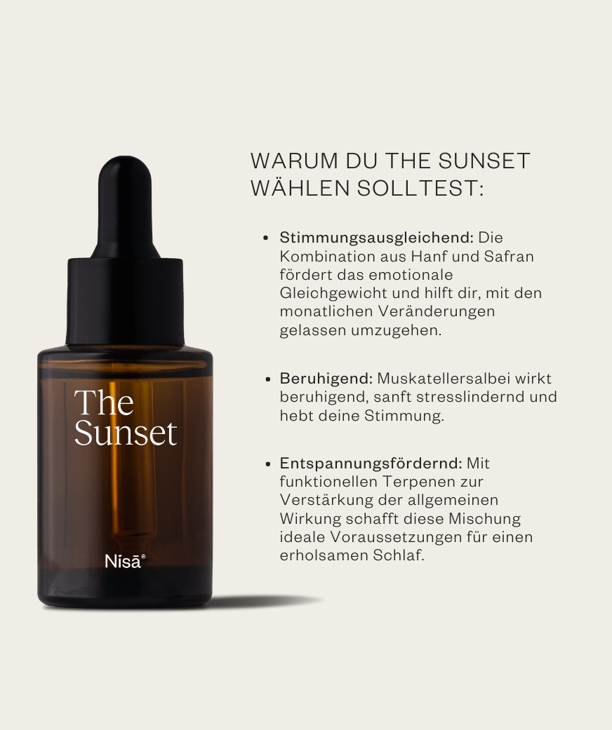 Die Tage vor deiner Perioden können sowohl emotional als auch körperlich anstrengend sein. Deine Stimmung schwankt, du bist unruhig und schläfst nicht gut – all das kann deinen inneren Frieden ins Wanken bringen. The Sunset wurde speziell mit CBD, Safran und Muskatellersalbei entwickelt, um Stimmungsschwankungen abzumildern, Stress im Alltag zu verringern und dir erholsamere Nächte zu verschaffen. Genieße mit dieser sanften, aber wirksamen Mischung deine verdiente Entspannung.