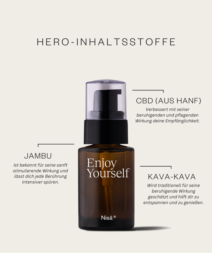 Erlebe eine neue Dimension von Intimität mit Enjoy Yourself, einem reichhaltigen Intimpflege-Öl mit CBD, Jambu und Kava-Kava. Diese luxuriöse Mischung regt die Durchblutung an und steigert das Empfindungsvermögen, während sie zugleich eine beruhigende und entspannte Atmosphäre schafft – perfekt, um deine intimsten Momente voll auszukosten.